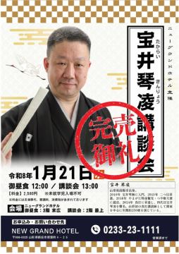 令和8年1月21日(水)開催予定の「ニューグランドホテル主催 宝井琴凌 講談会」につきまして、お陰様をもちましてチケットが完売いたしました。